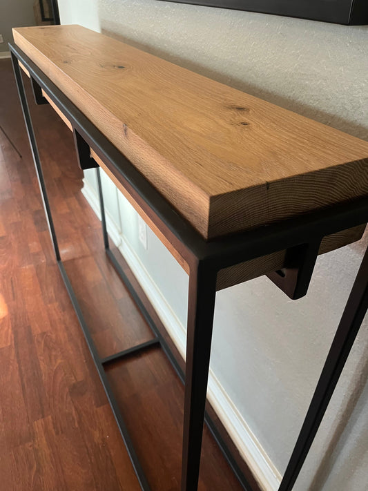 White Oak Narrow Entryway Console Table; Metal Basket Minimalist, 21st Century Sofa Table